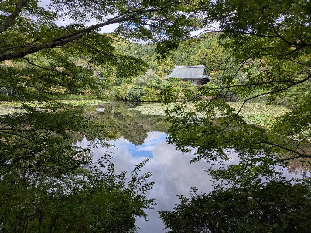 この池は、寺が建つ前からあったもので、かつては貴族の別荘の庭園だったと伝えられています。